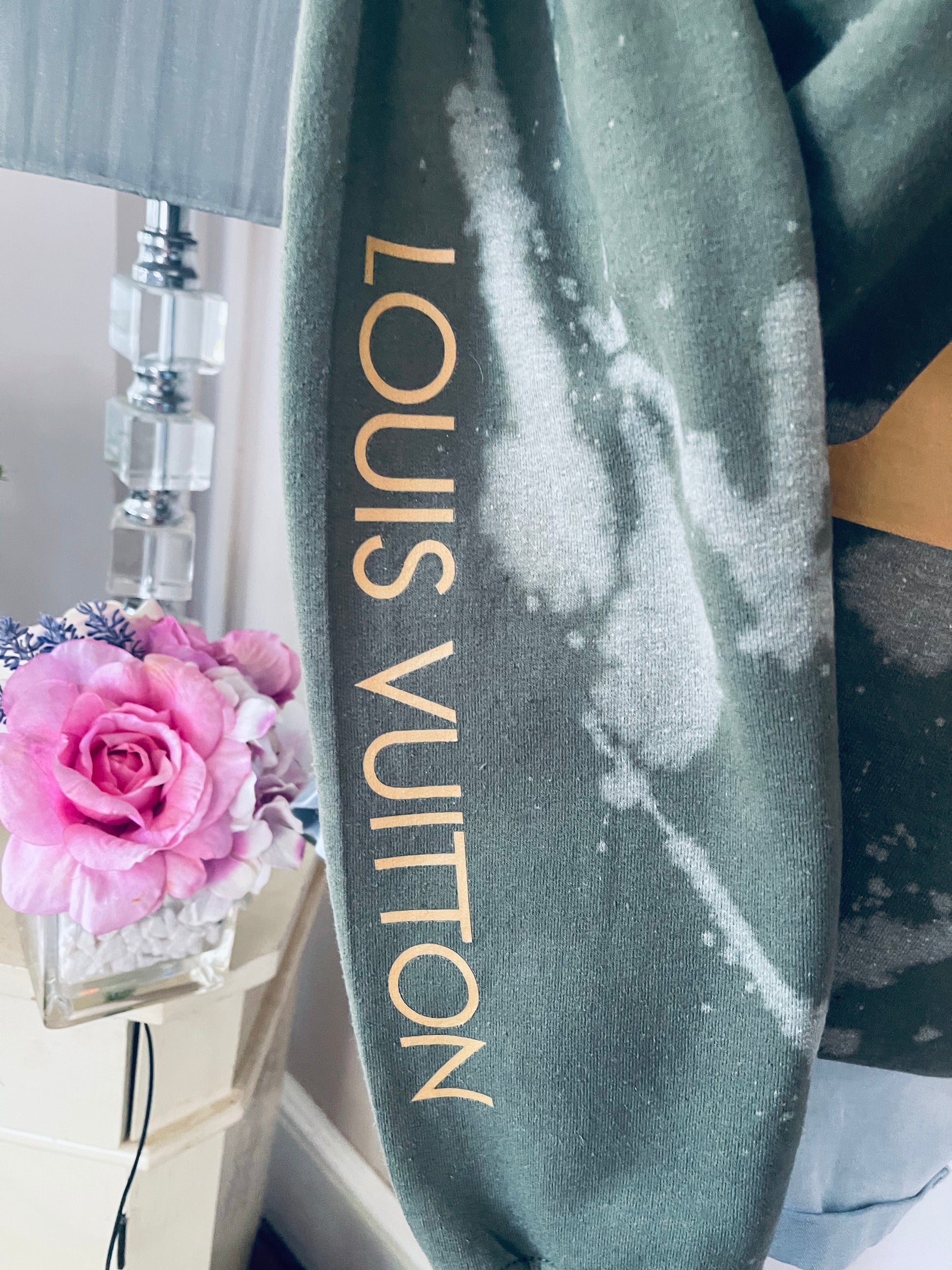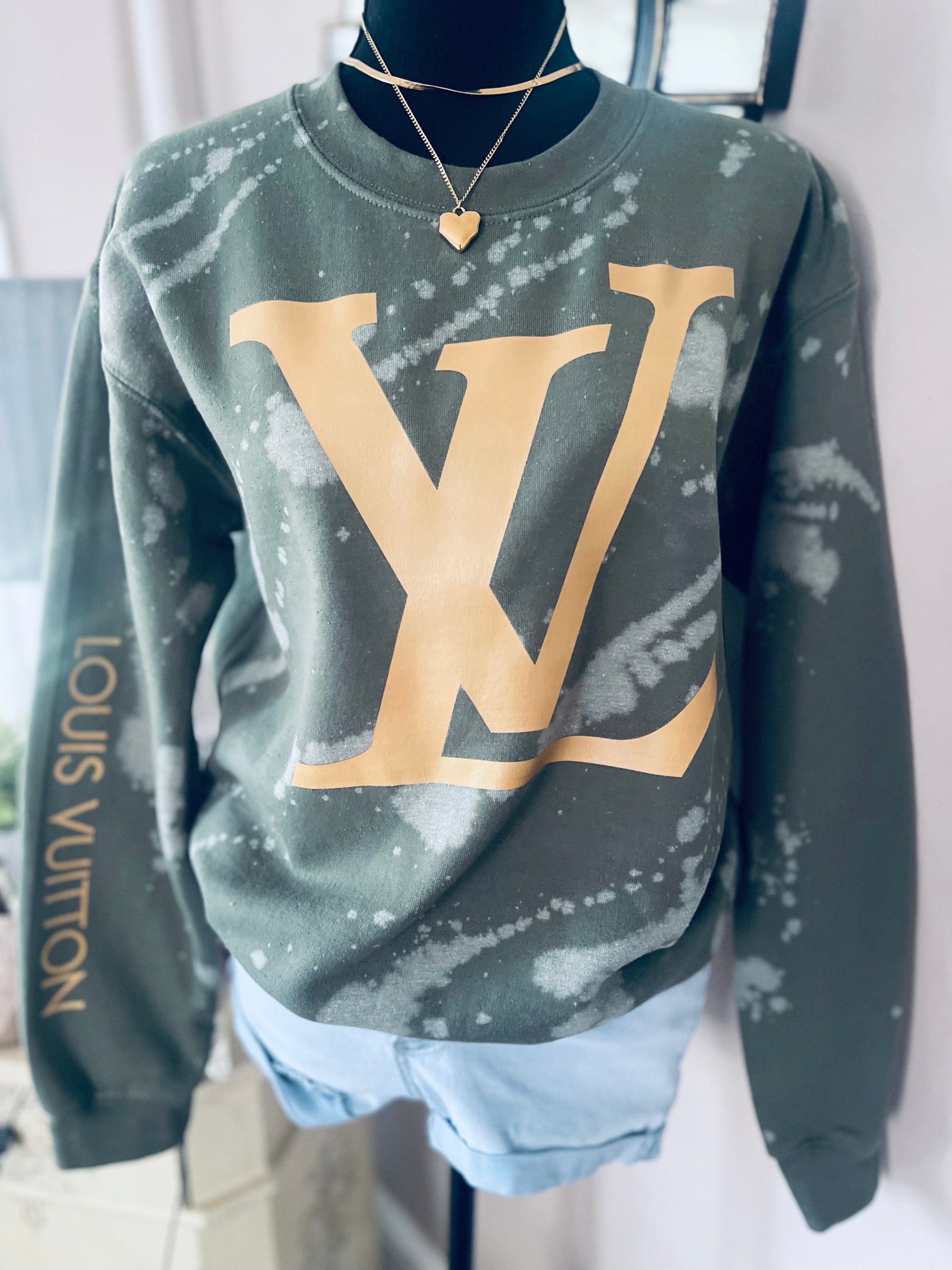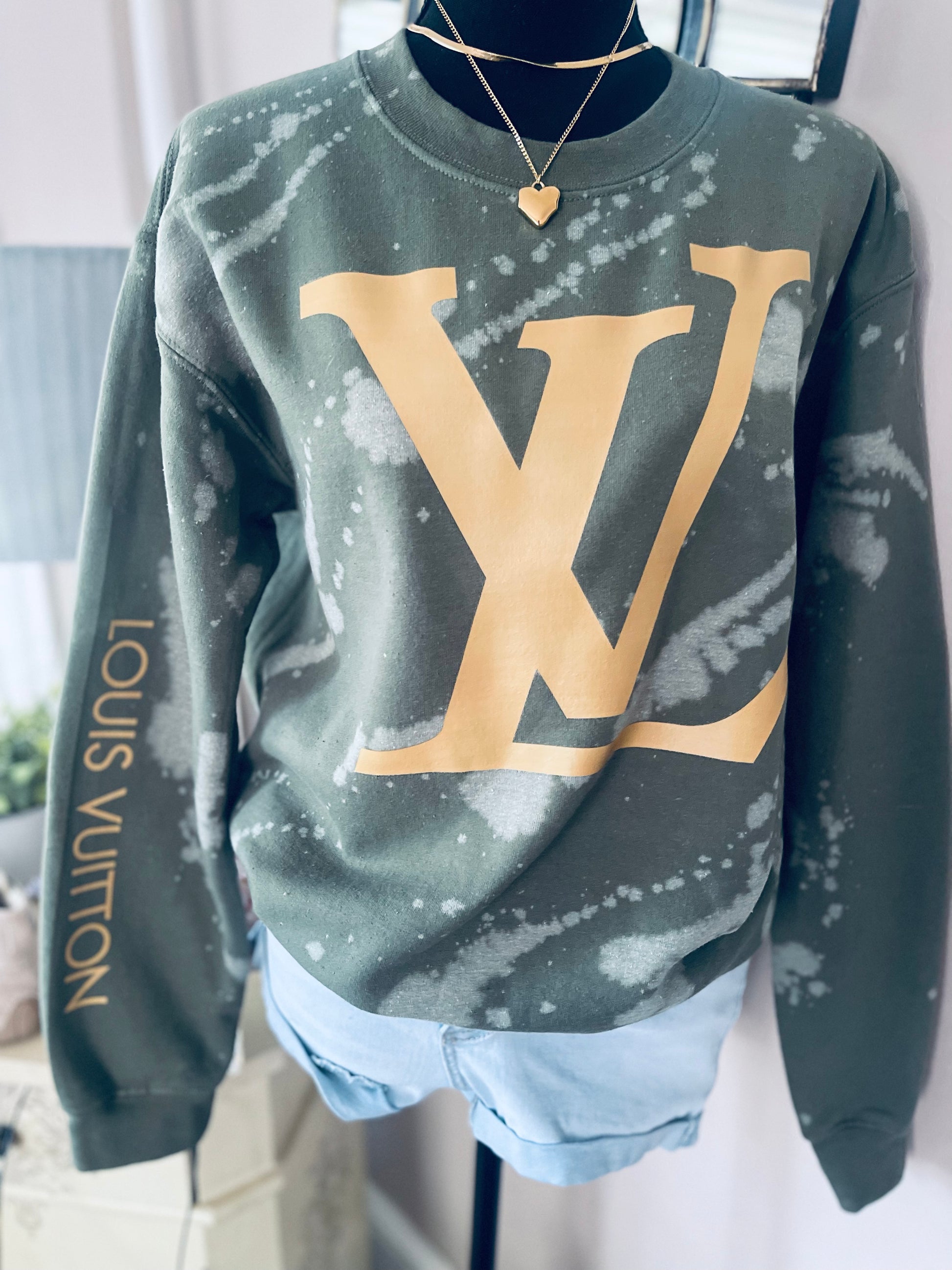 You will be IN LOVE with this custom acid washed green sweatshirt featuring Logo in Gold on chest and down sleeve.