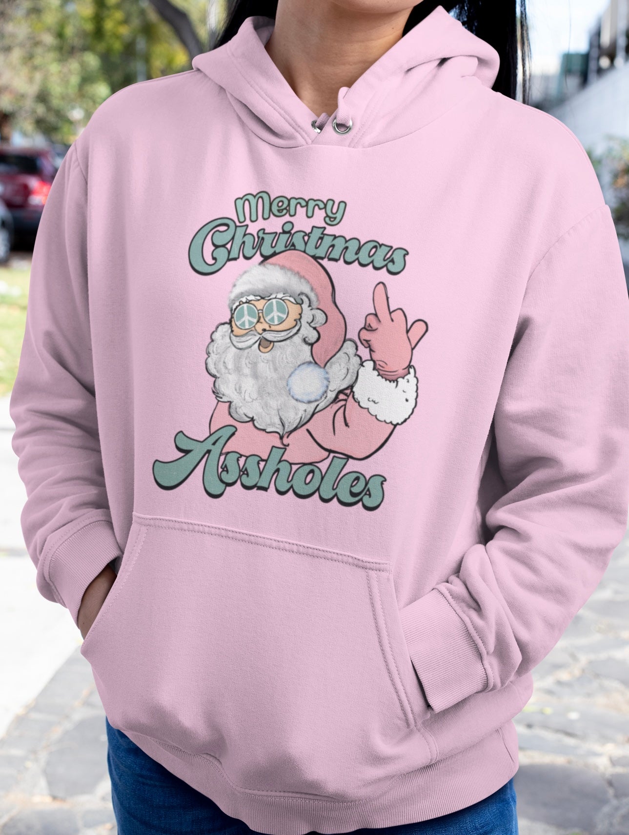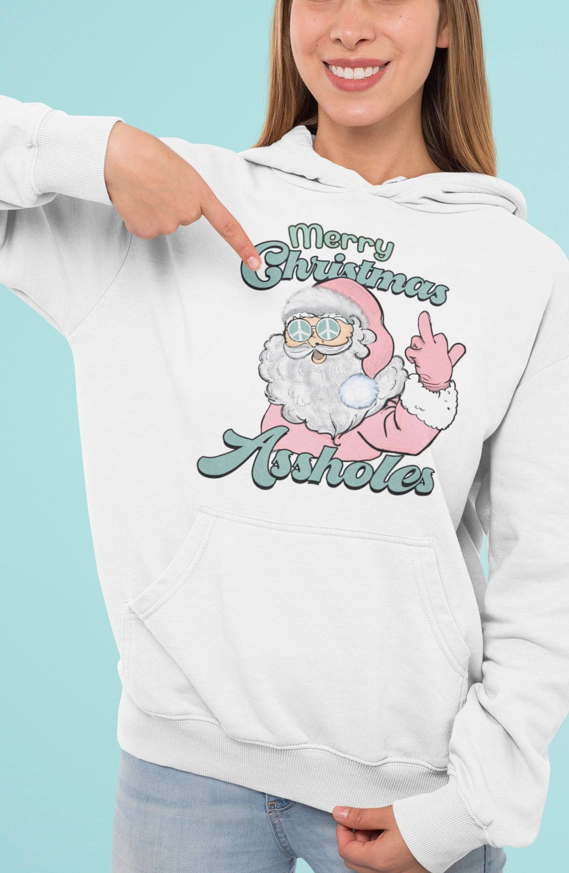 Soft, warm and funny Christmas hoodie. Featuring pink Santa Claus wishing everyone a very naughty holiday season.